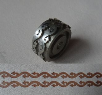 Ролик для тиснения NR-411600 руб. В корзинуРолик для тиснения кожи и картонаПрименяется для горячего и холодного тисненияУказана стоимость за один ролик, без держателяДиаметр 18 ммШирина орнамента 9 мм